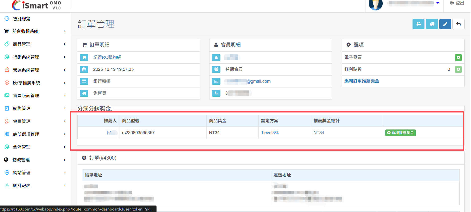 ⭕每筆訂單完整顯示 系統後台管理者清楚看到,會員適用的推薦獎金方案與金額,可手動、自動撥款,另再編輯獎金方案,自由控制,靈活運用。